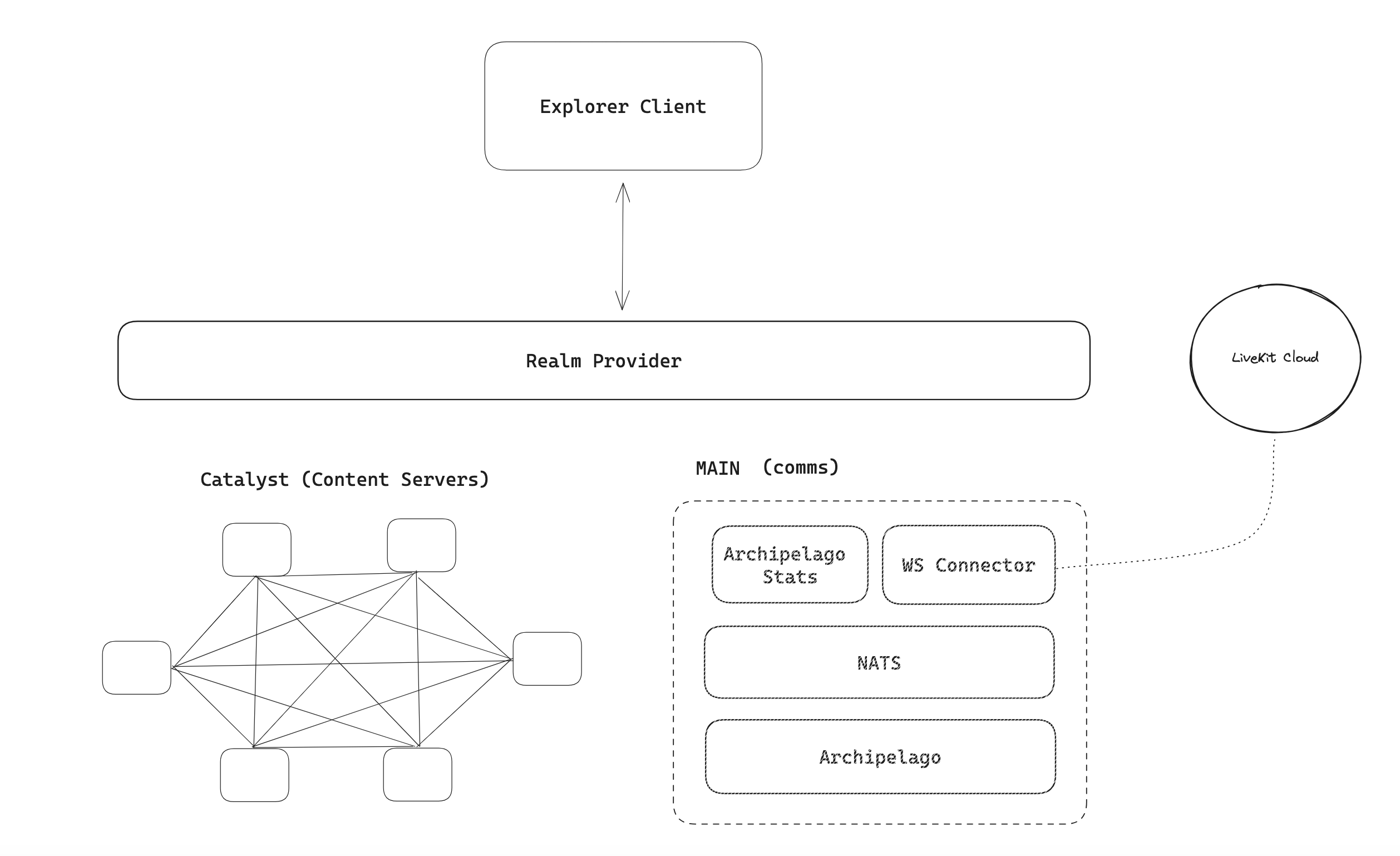 The fundamental concept derived from the MAIN realm is that different users have the flexibility to connect to any Catalyst node for content management purposes (downloads scenes, wearables, emotes, or send profile updates) but despite the selection of a specific content management node, the connection to the communication service can be the same. As a result, even if users are utilizing different Catalyst nodes as content servers but they find themselves at close scene coordinates, they will have the ability to interact with each other.