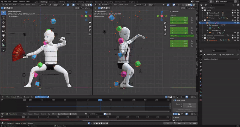 Emotes 2.0 can only have two armatures and two animation clips per file. If we just import the particles, we will end up with three armatures and three animation clips. The way to fix this is merging the particles armature into the prop armature. The reason to merge it to prop and not avatar armature is very simple: the avatar rig can’t be edited in any way by adding or deleting bones. This leaves prop armature as the only option.