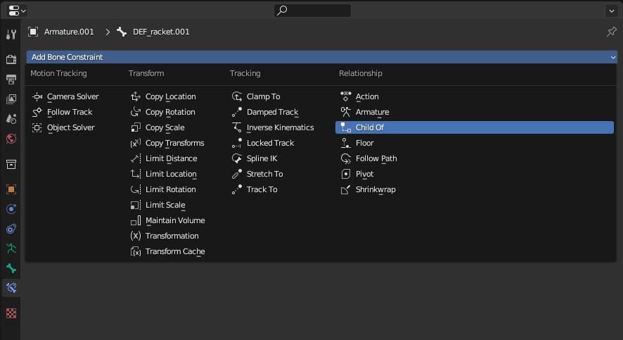 Some props might have to be attached to certain body parts, like a tennis racket to the hand. That can be done by simply adding a constraint. To do so, in Pose Mode, select the prop bone (the tennis racket one, for example), press CTRL + Shift + C on your keyborad and select Child of or just click on the Bone Constraint Properties tab and, in the drop down menu, select Child of.