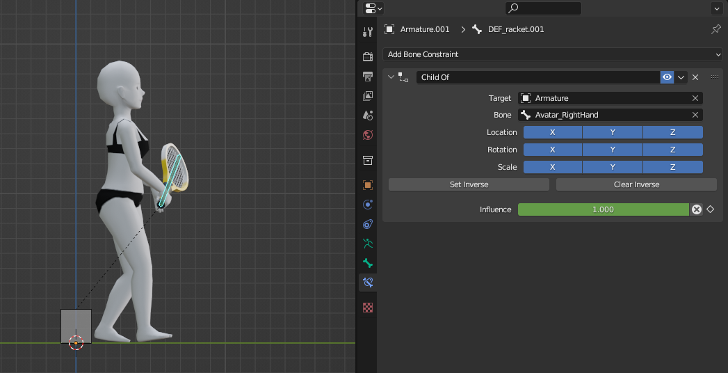Then, in Target, select the avatar armature and in Bone select the bone you want the prop to follow. To maintain the prop’s original position, click on Set Inverse once you add the constraint. If the influence is 1, the prop will fully follow the selected bone, if it’s 0, the constraint will be disabled. You can set keyframes on the influence to turn it on and off throughout the animation. To do that, just press I while the cursor is on top of Influence.