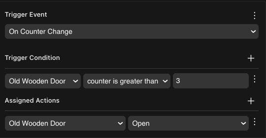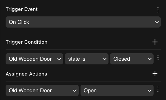 💡 Tip: Keep interactions between items simple. For example, avoid scenarios like having a button that opens a door by triggering three actions: play the door’s animation, play the door’s sound and change the door’s state. Instead, make the button change the door’s state. Then use an On State Change trigger so that the door itself handles playing the animation and sound whenever the state changes.