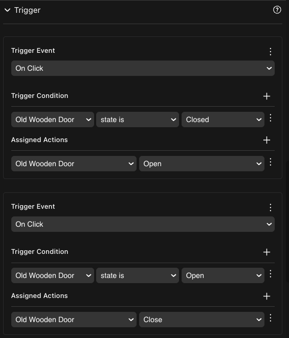 To toggle between two actions, define two triggers, each with a condition that checks a state. For example, doors have one trigger that activates the Open action, with a condition that first checks that the door’s state is Closed, and another trigger that activates the Close action, with a condition that checks that the door’s state is Open. Only one of the two is activated each time the player clicks on the door.