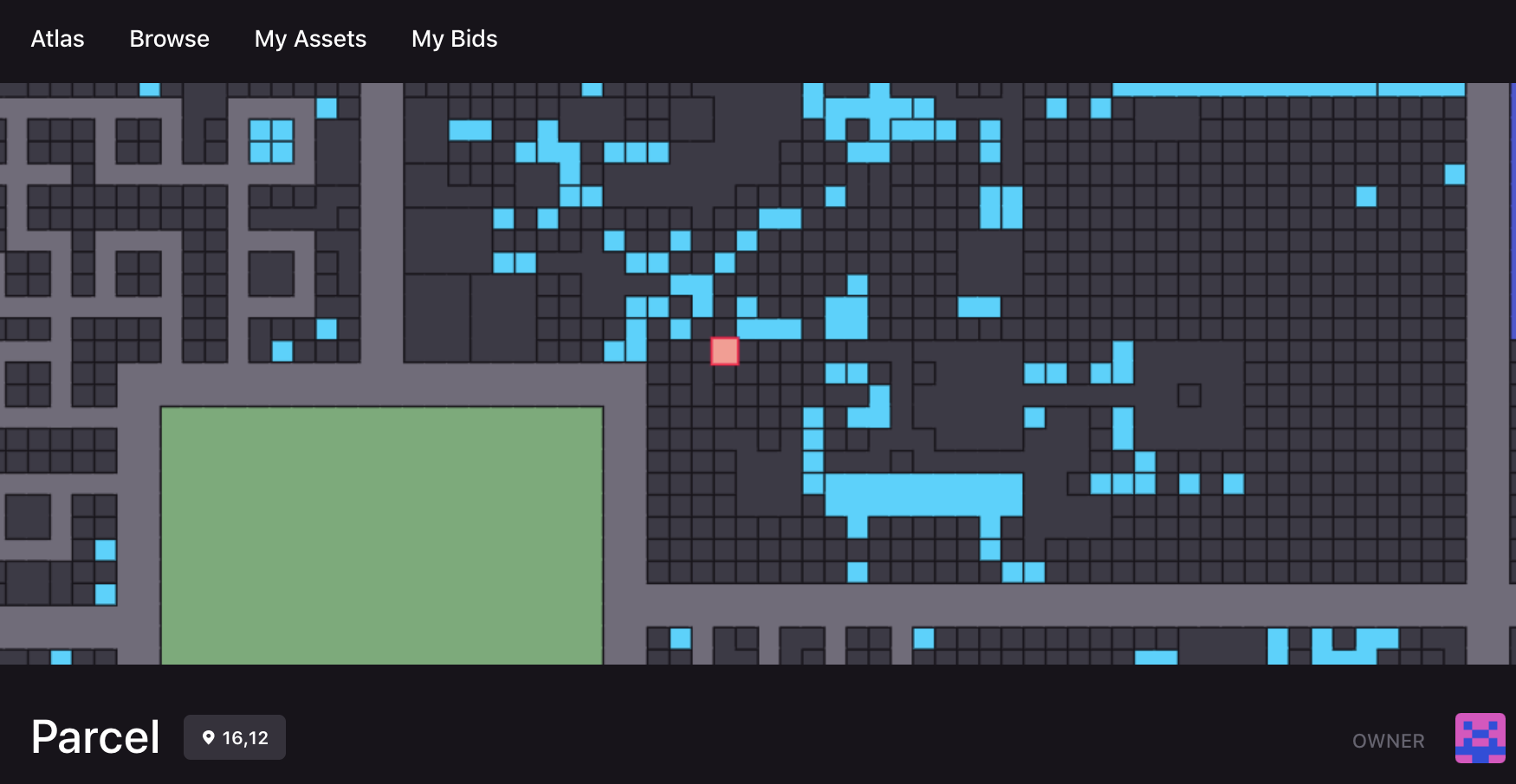 The Atlas view gives you a bird’s-eye perspective of every color-coded parcel, Estate, road, district, and plaza in Decentraland.